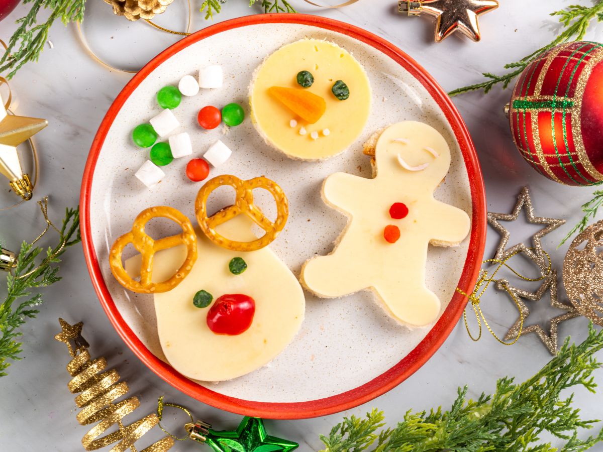 Preparación: Corta el pan y el queso con cortadores de galletas en forma de reno, muñeco de nieve o galleta de jengibre. Decora el reno con pretzels como cuernos, un tomate cherry para la nariz y espinacas para los ojos. Usa zanahoria y espinacas para el muñeco de nieve y caramelos comestibles para añadir detalles. Sirve en un plato festivo y disfruta.