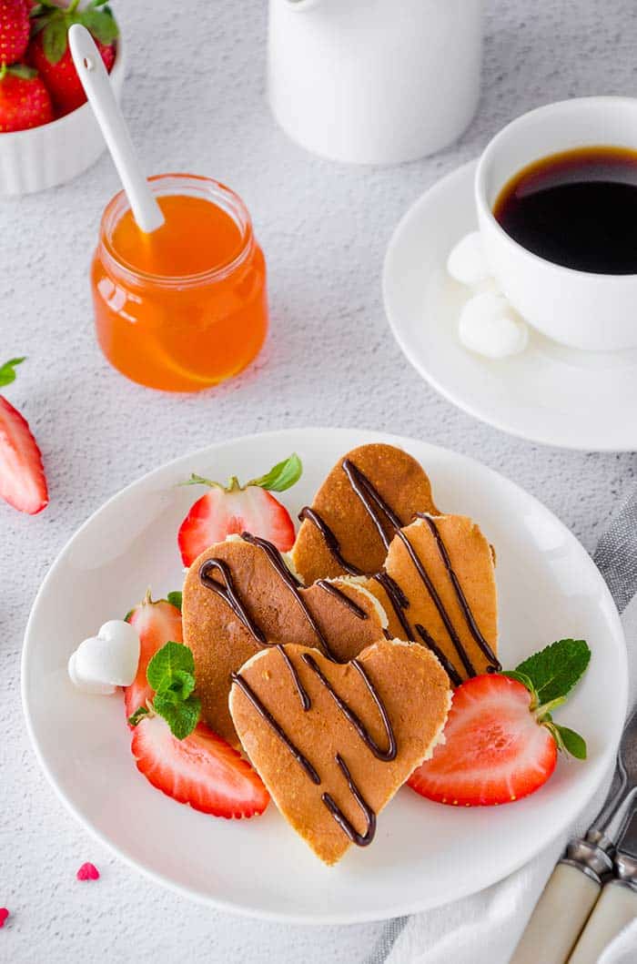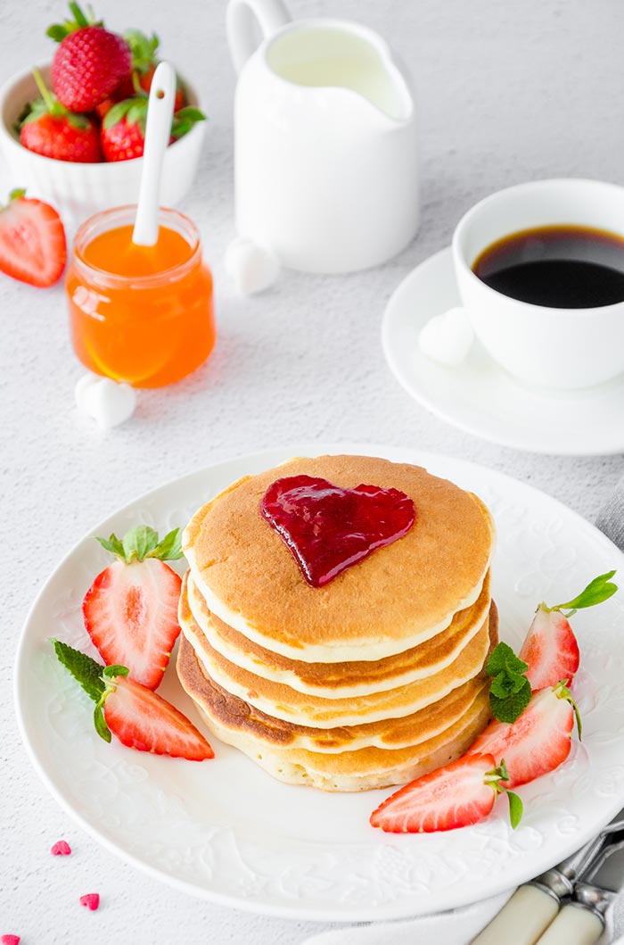 ¿Estás buscando un desayuno romántico que sea sencillo y original? Estas tortitas se preparan en un pis pas, solo tenemos que personalizarlas para que sean románticas. Podemos por ejemplo, decorarlas con un corazón de mermelada. Para ello solo tenemos que poner un cortador de galletas en forma de corazón (puedes comprarlos aquí) sobre la tortita y rellenar con mermelada, luego lo retiramos con cuidado y ya tenemos la decoración lista.