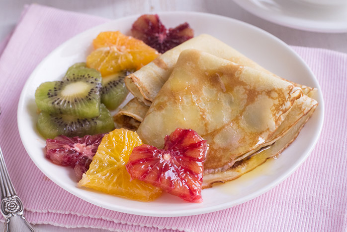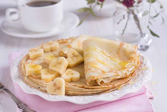 Unos crepes pueden ser un desayuno goloso o incluso un brunch. Podéis simplemente rellenar los crepes con Nutella, dulce de leche o mermelada y servirlos con fruta fresca cortada con un cortador en forma de corazón (usando cortadores como estos), todo rociado con miel o sirope.