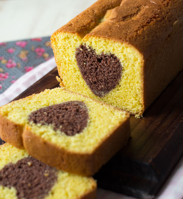Este es en apariencia es un bizcocho tradicional, pero al cortarlo esconde un corazón. Es muy sencillo de hacer, no necesitas nada más que un molde de plum cake y un cortador de corazón: