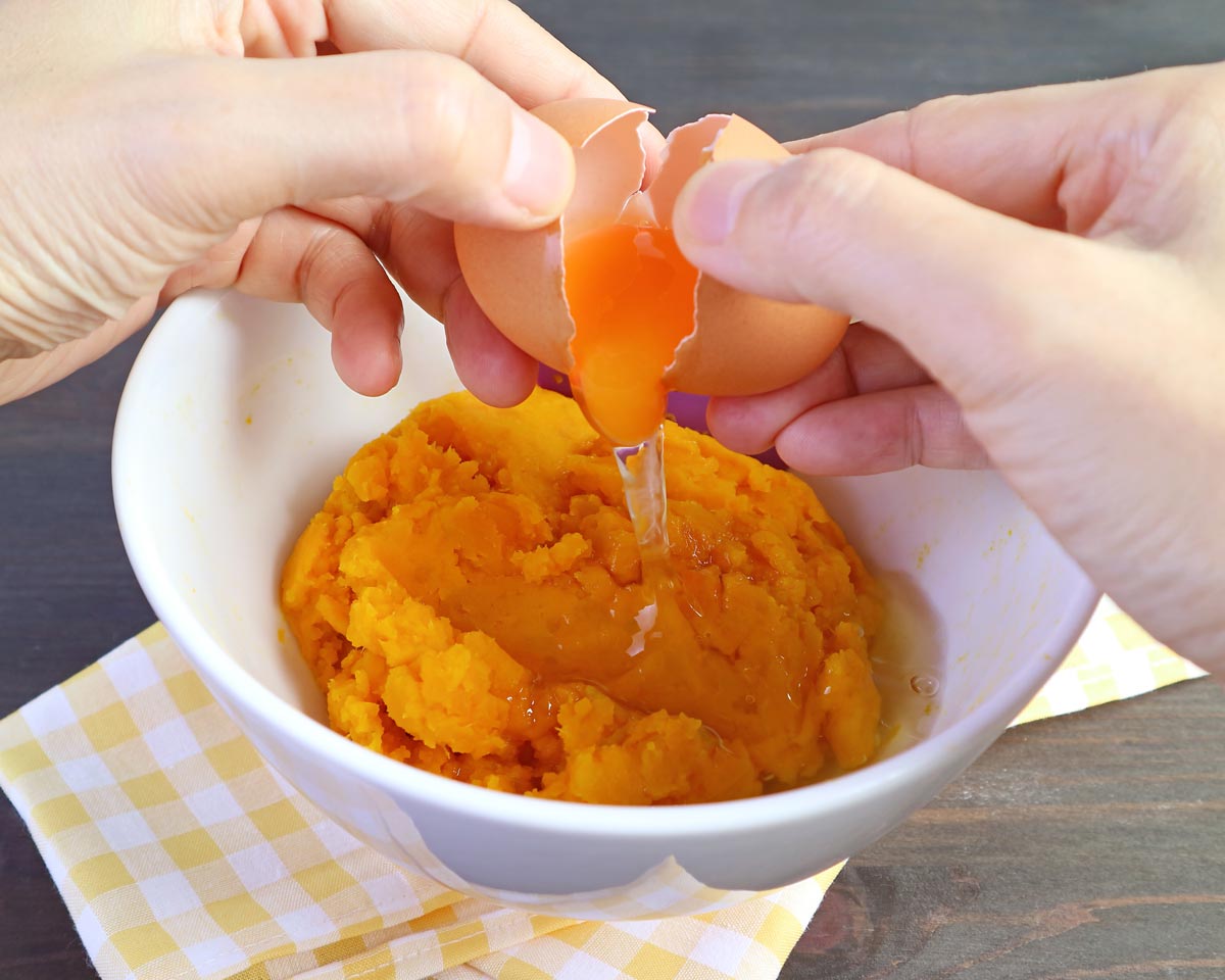 - Tamizamos la harina con las especias y agregamos a la levadura junto con el puré de calabaza, el huevo y el azúcar.