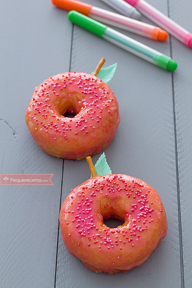 En este caso hemos ido un poco más allá, decorando nuestros donas en forma de manzana con un glaseado rojo: tan sólo lleva azúcar glas, colorante rojo y bolitas rojas de azúcar, para decorar palitos salados y las hojas son unas obleas en forma de hoja (las encontraréis en las grandes superficies).