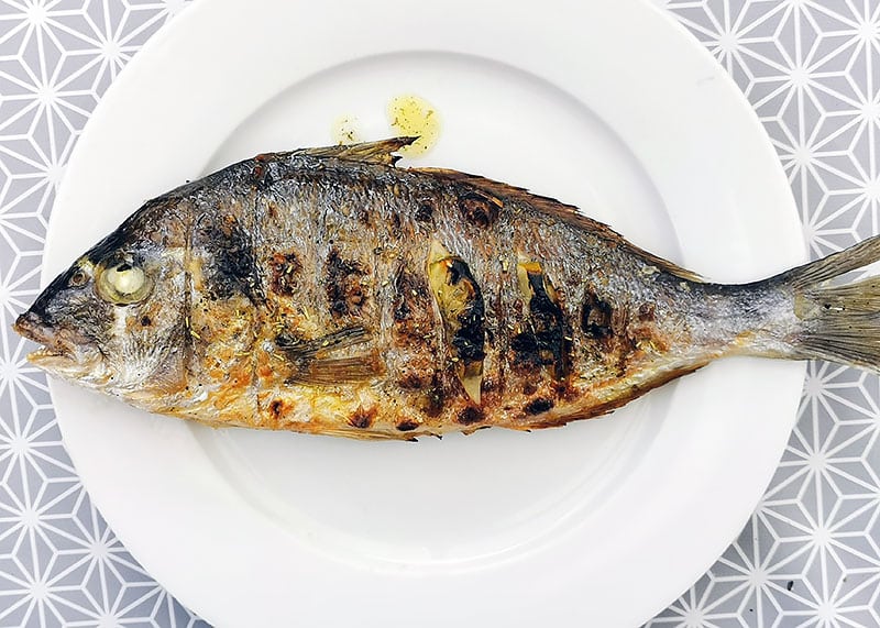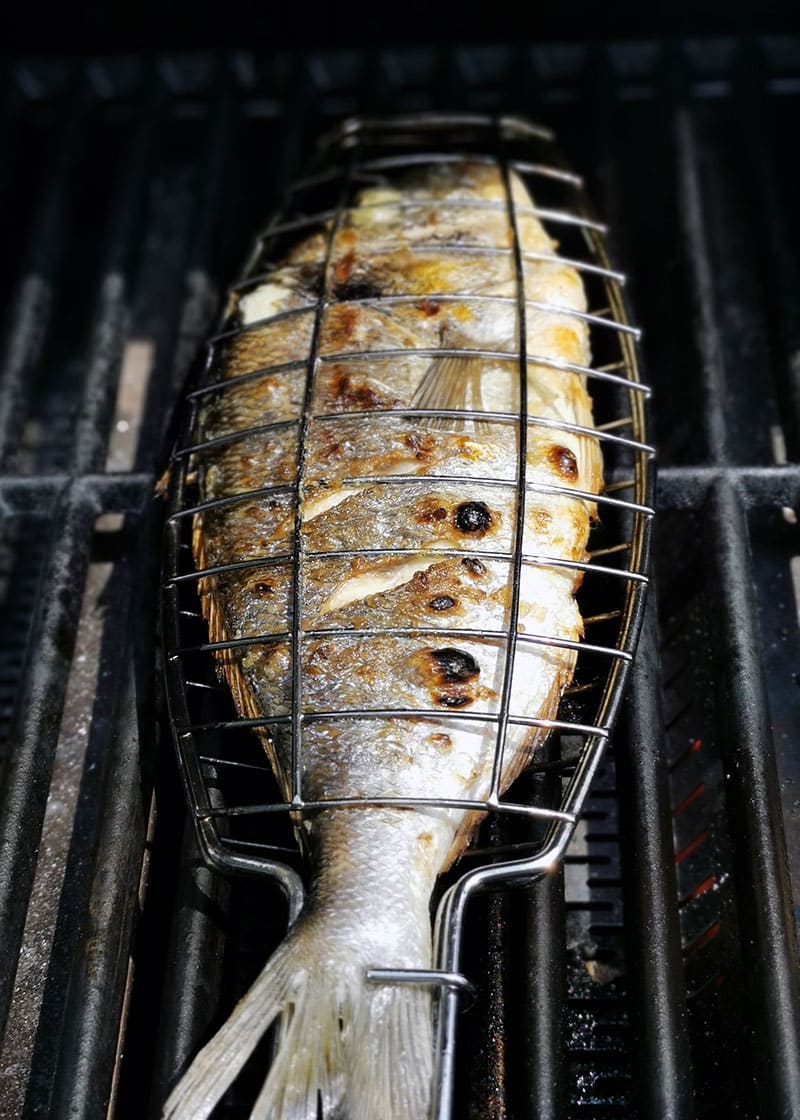 Si no tenéis parrilla de pescado por supuesto podéis poner la dorada directamente en la parrilla, simplemente tenéis que tener cuidado de que no se pegue (para ello ayudará el haberla impregnado previamente con aceite de oliva y la marinada) y darle la vuelta con cuidado.