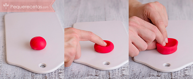 - Cogemos una pequeña porción de fondant rojo y hacemos una bolita, con el dedo índice marcamos el centro y vamos haciendo pequeños círculos para hundir el centro de la bolita. Con dos dedos vamos subiendo poquito a poco y sin presionar mucho los laterales de la bolita.