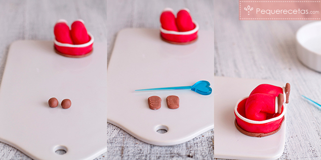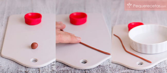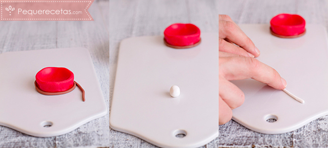 - Cogemos una bolita de fondant marrón y estiramos formando un pequeño cordón, preparamos un poquito de agua. Nos va a servir de pegamento.