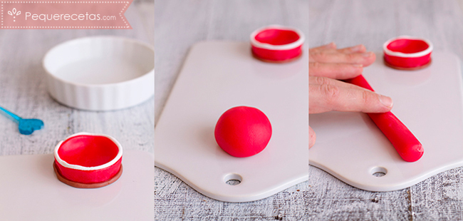 - Cogemos una porción más de fondant rojo (esta vez más grande). Formamos una bola y la estiramos con las manos.