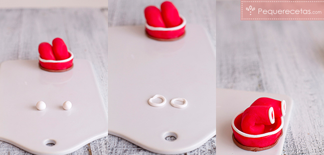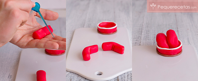 - Estiramos el fondant blanco formando un pequeño cordón y lo enrollamos sobre sí mismo, haciendo dos círculos.