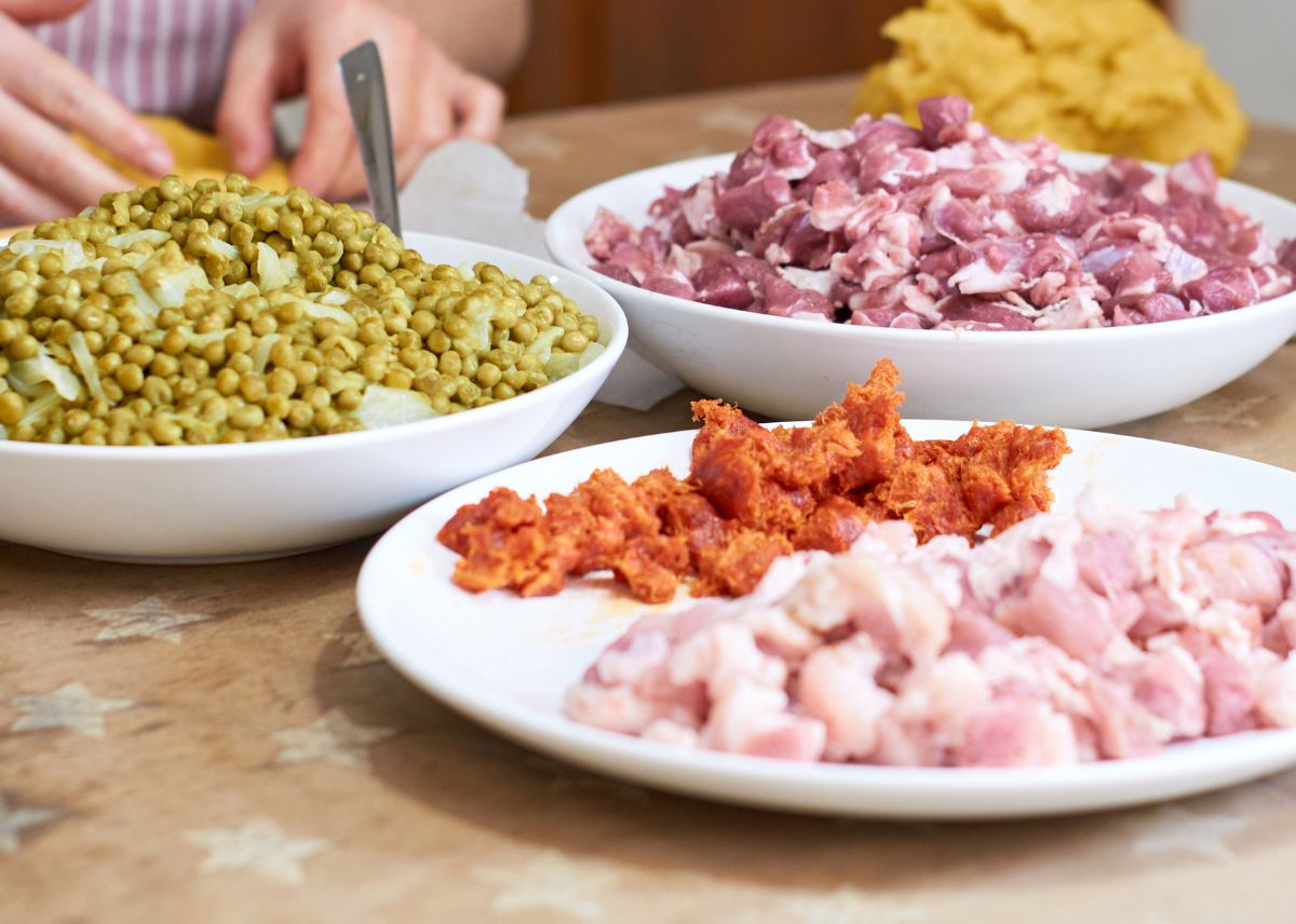 - Incorpora los 150 g de guisantes al cordero y mezcla nuevamente. Deja reposar esta mezcla en la nevera mientras preparas la masa.