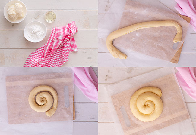 Estiramos suavemente el churro de masa para que gane longitud y lo colocamos de forma espiral sobre el papel de hornear (no hacer la espiral prieta para dejar que tenga espacio una vez fermente), dejar levar dentro del horno apagado durante 12-14 horas con un cazo de agua tibia en la base del horno para ayudar a que la masa fermente bien.