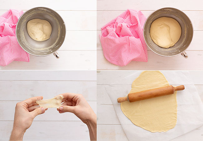 La masa hay que estirarla lo más posible para que quede casi transparente, de la misma forma que se hace con los strudel por ejemplo. Buscad una superficie lo suficientemente amplia para que podáis estirarla con un rodillo lo máximo que os permita, incluso si se os rompe.