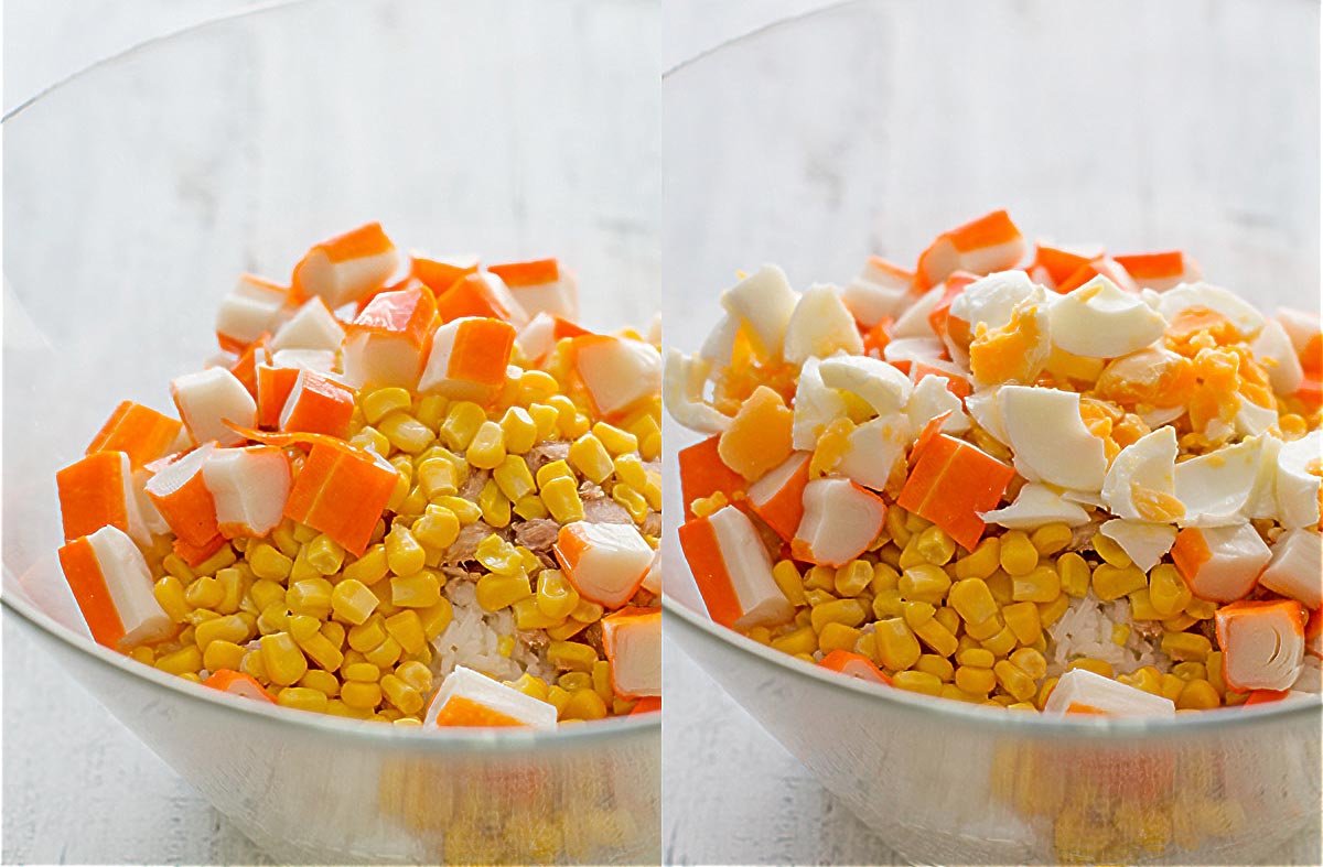 Cocemos el arroz siguiendo las instrucciones, escurrimos, enjuagamos en agua fría y condimentamos con 1 cucharadita de aceite. Reservamos. Cocemos los huevos y cortamos en cubitos. Cortamos también los palitos de cangrejo en cubitos. Lavamos bien el pepino y lo cortamos en cubitos pequeños. Ponemos en un bol el arroz, los huevos cocidos cortados, el pepino, los palitos de cangrejo, el maíz y la mayonesa. Mezclamos bien y enfriamos en la nevera hasta el momento de servir.