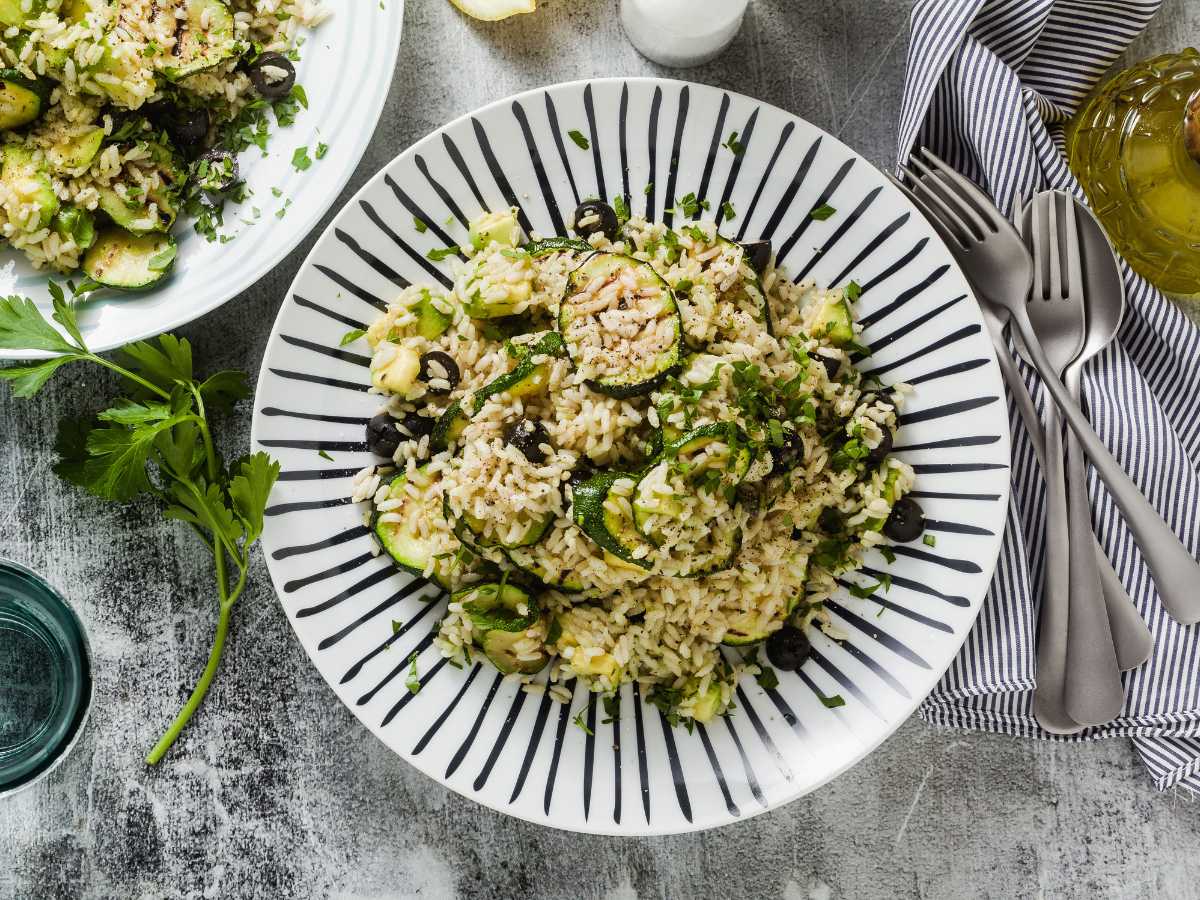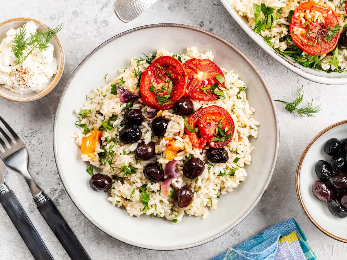 Esta ensalada griega de arroz se puede disfrutar como un plato principal o como acompañamiento de otras comidas.
