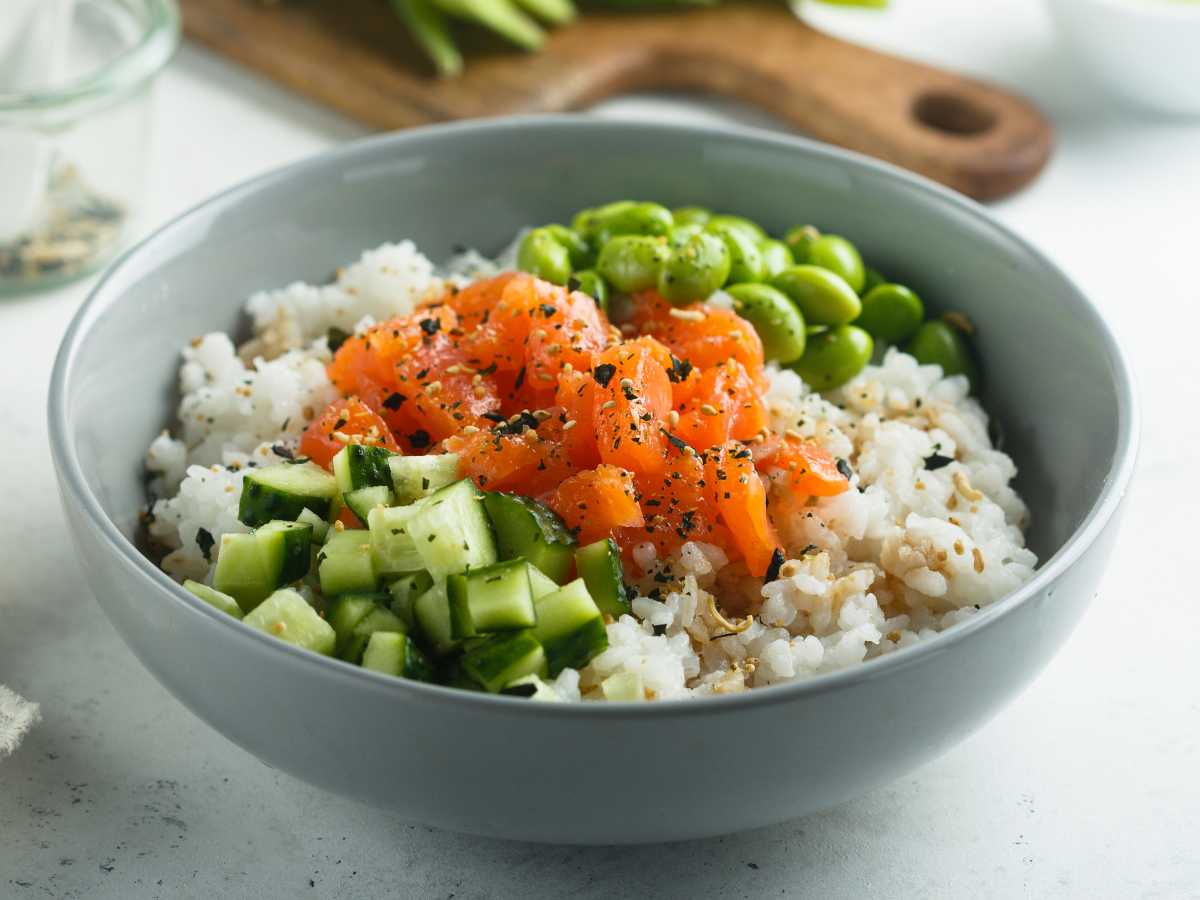 Una vez que todos los ingredientes estén preparados y fríos, colócalos en un bol grande: el arroz, el salmón ahumado, el edamame y el pepino. Para el aliño, mezcla aceite de oliva virgen extra con vinagre de arroz o jugo de limón, y sazona con sal y pimienta al gusto. Vierte este aliño sobre los ingredientes en el bol y revuélvelo bien.