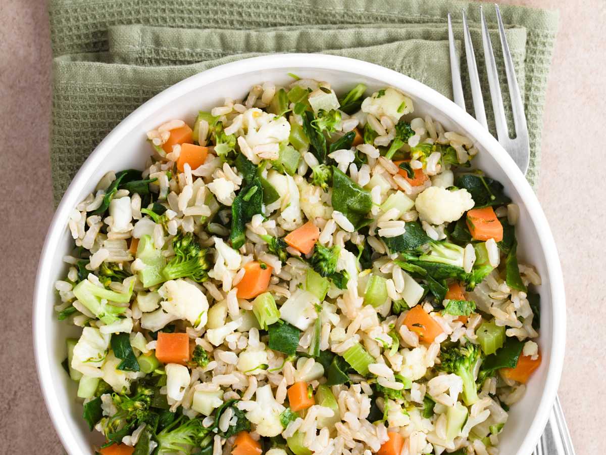 200 g de arroz de grano largo; 1 brócoli mediano, cortado en floretes; 1 coliflor mediana, cortada en floretes; 2 tallos de apio, finamente picados; 1 manojo de acelgas, cortadas en tiras finas; 2 zanahorias medianas, en cubitos.