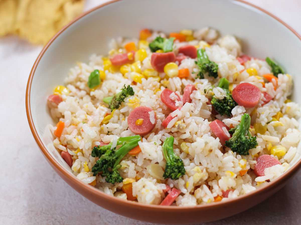 - Mezcla el arroz tibio con las salchichas y las verduras en un bol grande.