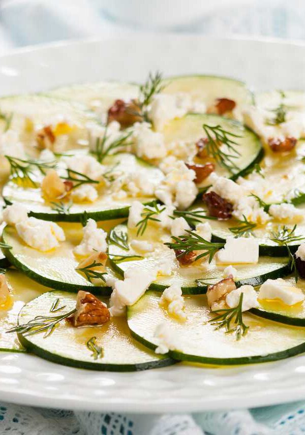 Una opción original y ligera es preparar un carpaccio de calabacín. En este caso se prepara con nueces y queso de cabra, y te aseguro que queda delicioso.