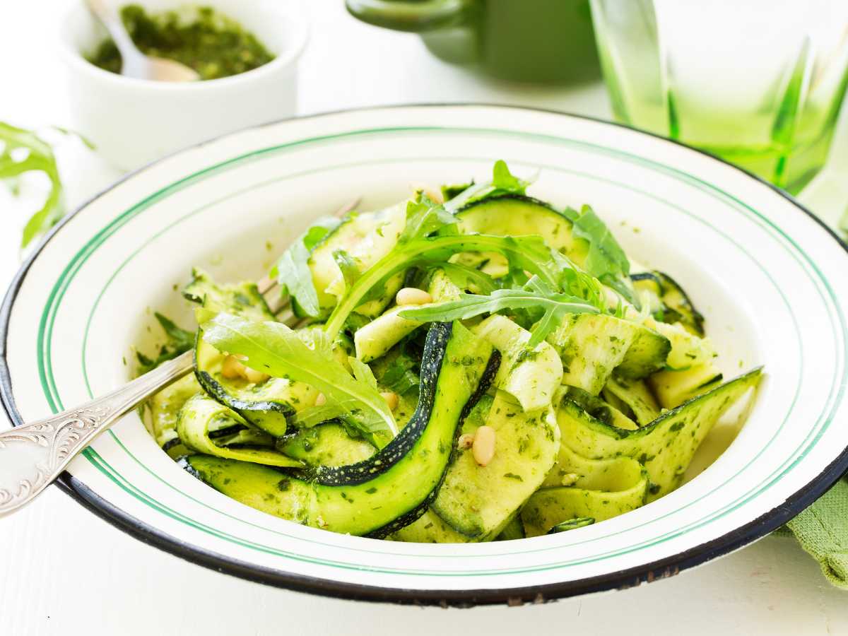 Ensalada de calabacín con pesto, rúcula y piñones
