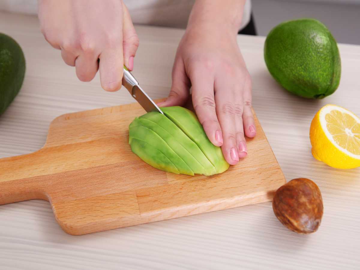 Cortamos el aguacate por la mitad, retiramos el hueso y lo pelamos con cuidado. Lo cortamos en gajos o trozos medianos.