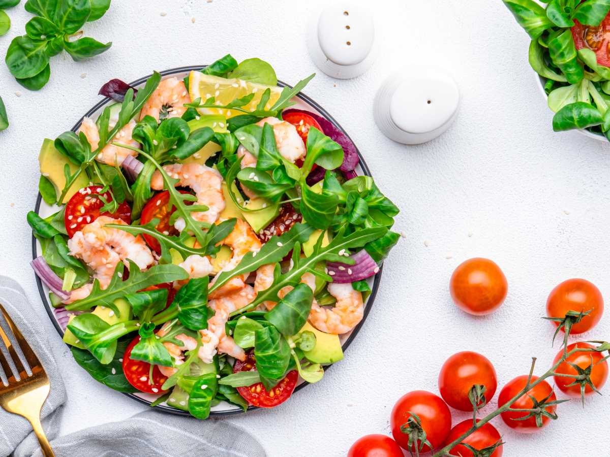 Esta ensalada de canónigos y rúcula tiene todo lo que se le puede pedir a un plato: proteína, grasas saludables, color, sabor y cero complicaciones. Al incorporar aguacates y langostinos se convierte en un plato completo y lleno de nutrientes.