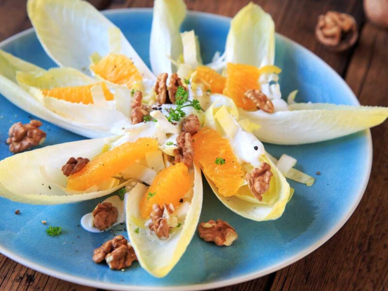 Más allá de las tradicionales endivias con roquefort que seguramente hayas comido alguna vez, otra opción que te recomendamos sin duda es la ensalada de endivias. Su ligero amargor y textura crujiente las convierten en la base perfecta para ensaladas, combinando bien con frutas, quesos y frutos secos. Además, son una opción ligera y baja en calorías, lo que las hace ideales para platos equilibrados sin renunciar al sabor.