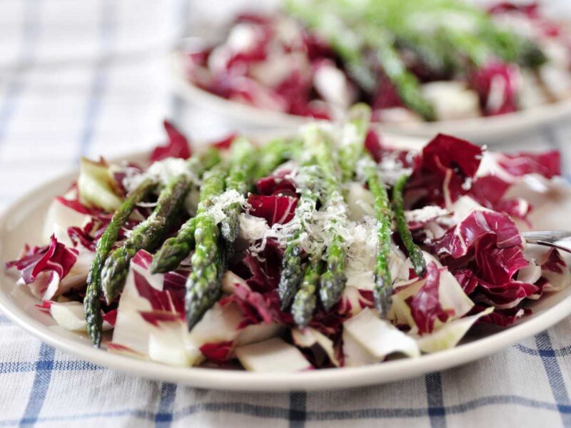 2 endivias blancas; 1 endivia morada; 8 espárragos verdes; 30 g de queso parmesano rallado; 1 cucharada de aceite de oliva virgen extra; 1 cucharadita de vinagre balsámico; sal y pimienta al gusto.