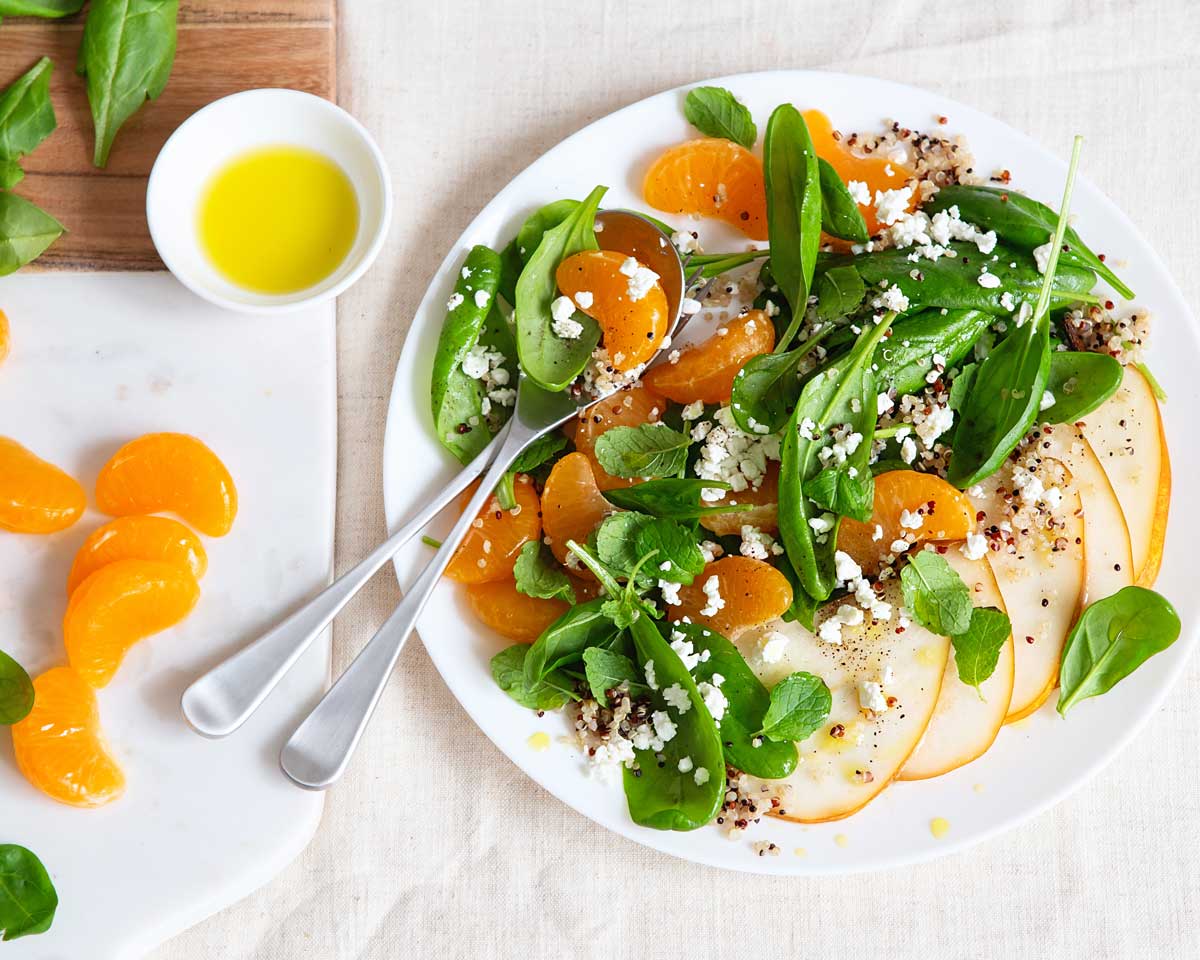 Esta ensalada de espinacas con quinoa y frutas es muy fácil de hacer. Para ello solo tienes que cocer quinoa, y acompañarla de gajos de naranja, pera en láminas y queso de cabra desmenuzado. Lo aliñamos con aceite, vinagre y sal.