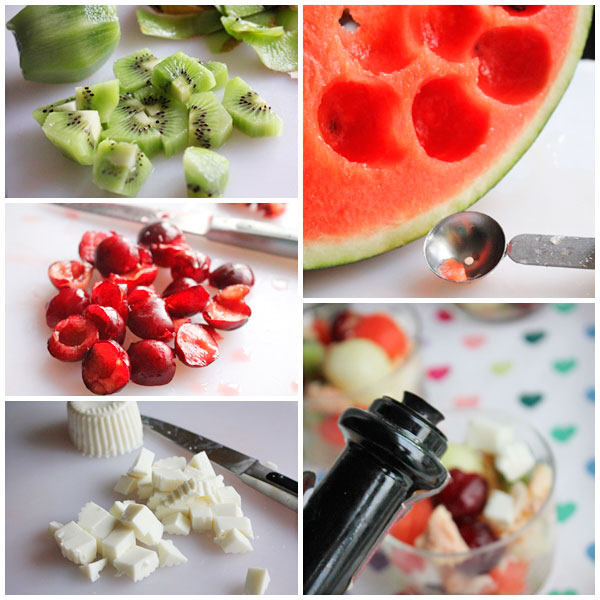 - El melón y la sandía podéis cortarlo en dados o si tenéis un sacabolas, hacer bolitas, como os guste.