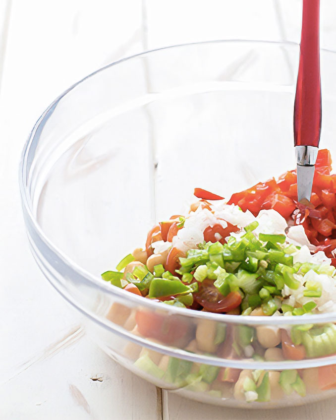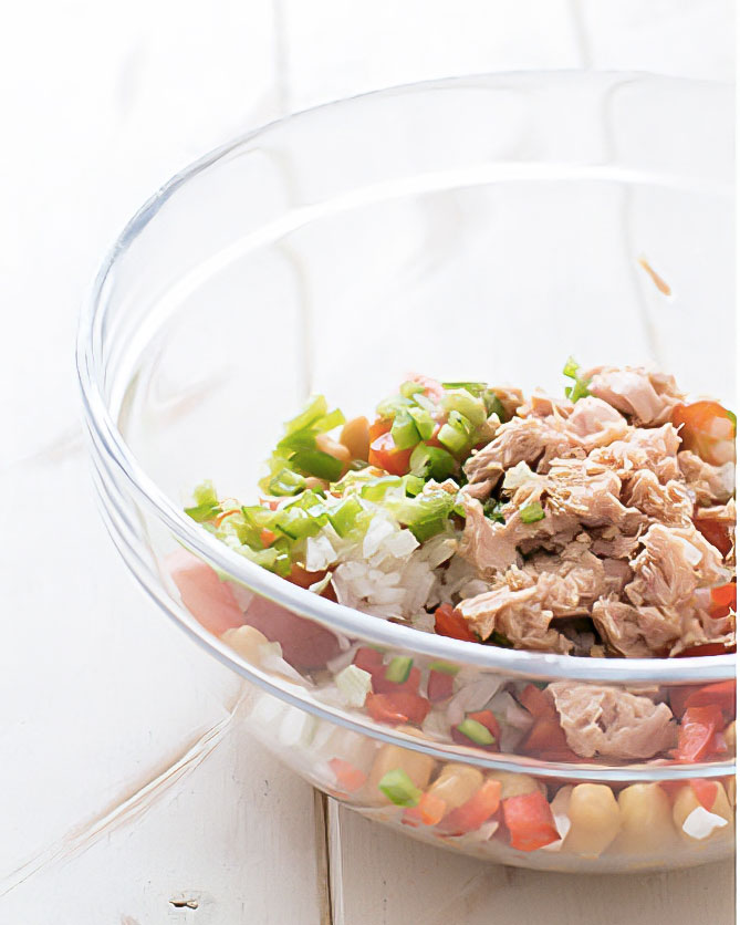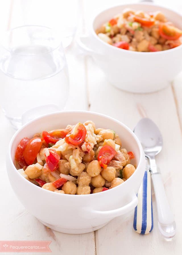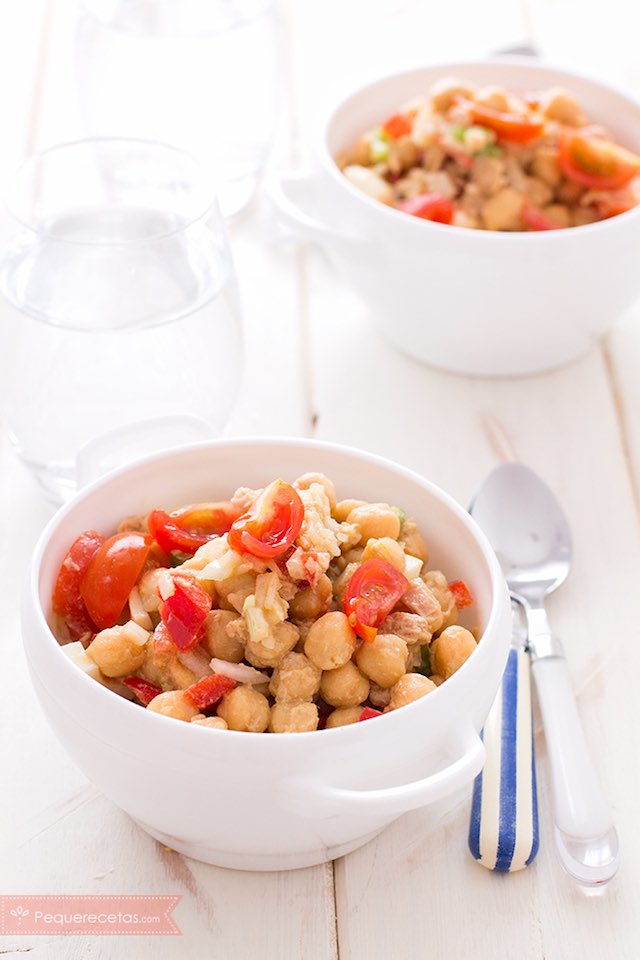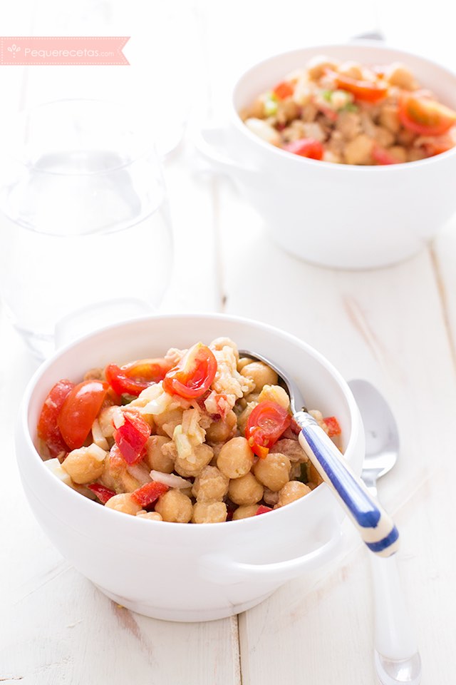 - Ensalada de garbanzos y tomate con atún y aceitunas