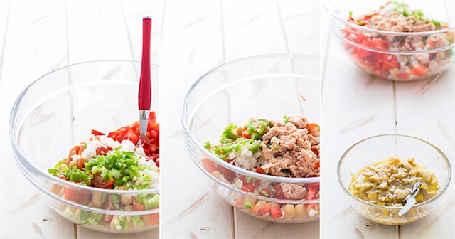 - Cortamos en trocitos pequeños el pimiento rojo, pimiento verde y la cebolleta. Introducimos al bol y mezclamos bien.