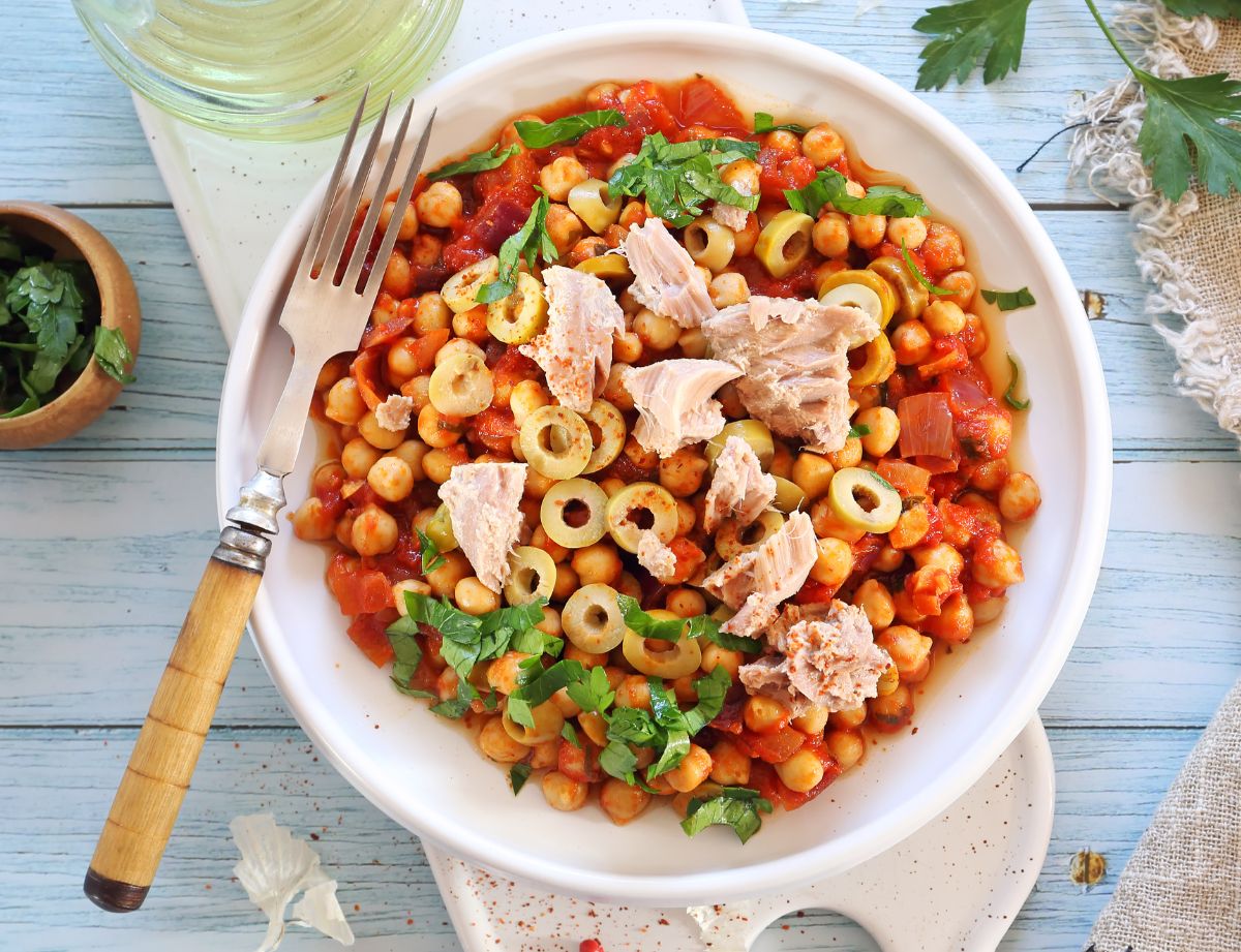 Ensalada de garbanzos y tomate con atún y aceitunas