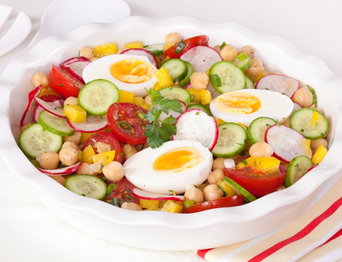 La ensalada de garbanzos mixta, con tomate, pepino, cebolla y huevo es un plato que nunca falla.