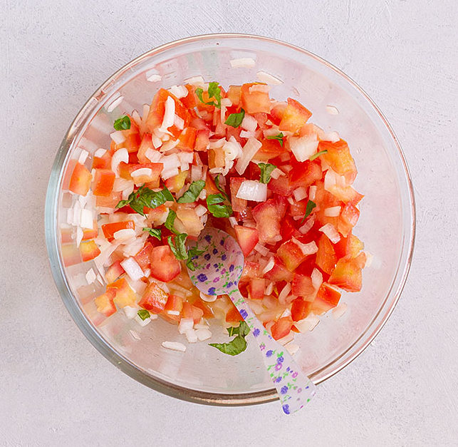 - En un recipiente colocamos tomate picado, cebolleta picada, albahaca picada, mezclamos ligeramente.