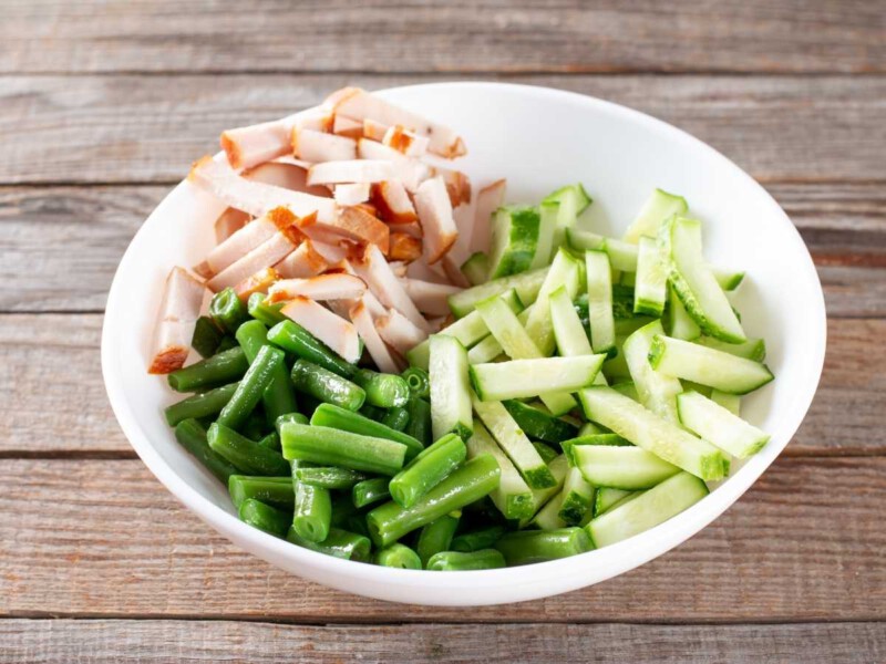 - Mezcla los ingredientes: En un bol grande, mezcla las judías verdes, el pollo, y el pepino.
