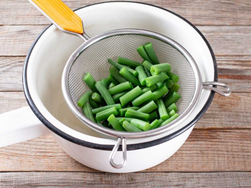 - Cocina las judías verdes: Cocina las judías verdes en agua con sal durante unos 3-4 minutos o hasta que estén tiernas pero aún crujientes. Luego, escúrrelas y enfríalas con agua fría para detener la cocción.