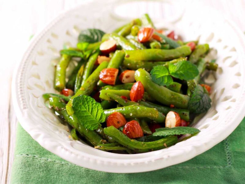 Esta ensalada con judías verdes es perfecta para una comida ligera o como acompañamiento. La combinación de las judías verdes crujientes con las almendras tostadas y la frescura de la menta la hace única y refrescante.