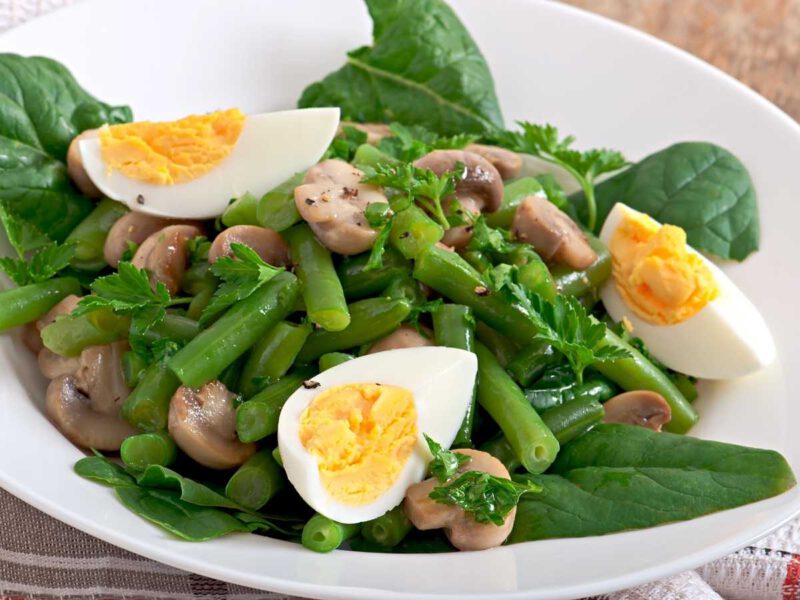 - Arma la ensalada colocando las hojas de espinaca como base en un plato, seguido de las judías verdes, los champiñones y los huevos duros.