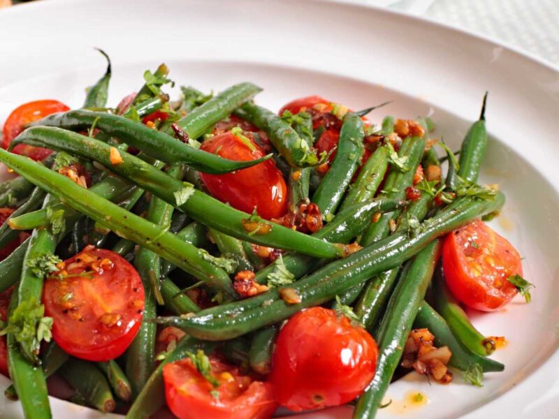Esta ensalada templada de judías verdes y tomates cherry es una opción fresca y ligera, perfecta como guarnición o plato principal. Los tomates cherry y el ajo salteado añaden un toque especial que complementa perfectamente las judías verdes.