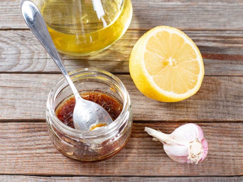 - Preparación de la vinagreta: Para preparar la vinagreta, exprime el jugo de medio limón en un bol pequeño, añade un diente de ajo picado finamente, tres cucharadas de aceite de oliva virgen extra, una cucharada de vinagre balsámico y una cucharadita de miel (opcional). Mezcla bien todos los ingredientes, agrega sal y pimienta al gusto, y emulsiona la mezcla batiéndola con un batidor pequeño o un tenedor hasta obtener una consistencia homogénea.