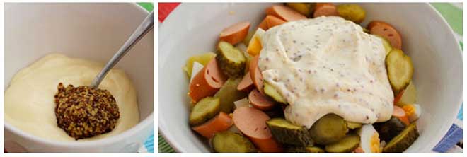 Prefiero preparar la ensalada de patatas sin salchichas, calentarla en una olla y comerla con mostaza forte (Dijon).