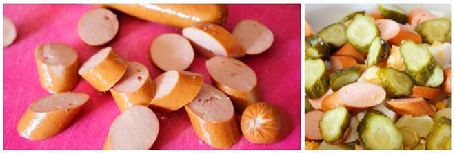 En un recipiente ponemos las patatas, la cebolleta picadita, las salchichas que cortamos en rodajas, al igual que los pepinillos.
