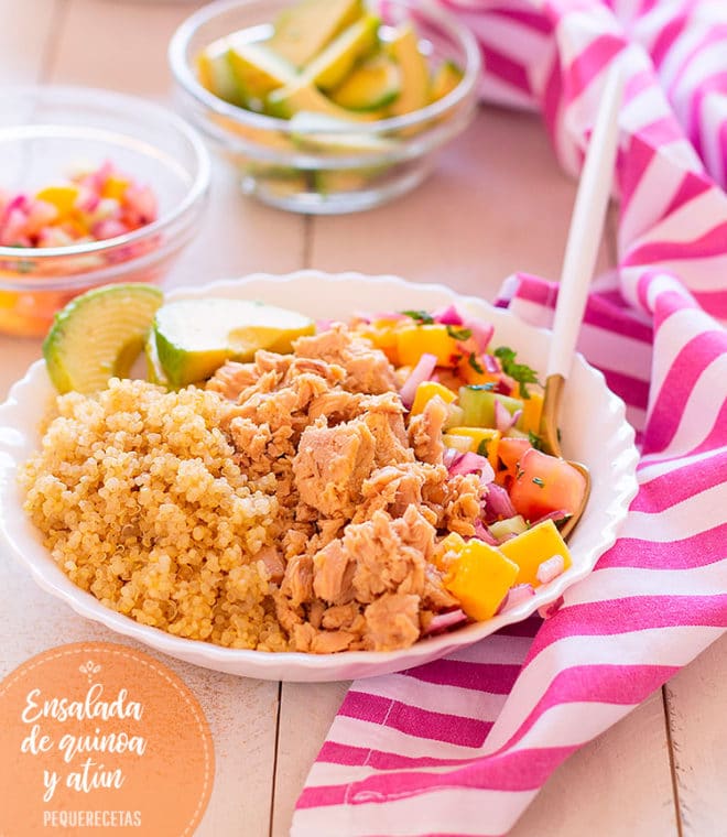 Ya os habíamos dicho que este verano teníamos intención de comer sano y ligero, con recetas de ensaladas y otras propuestas fresquitas y fáciles de hacer, pero muy vistosas para el menú familiar ¡no me digáis que esta ensalada de mango y aguacate con atún y quinoa no entra por los ojos inmediatamente con tanto color! Además lleva también una salsa de mango, con un aliño muy refrescante que aporta el jugo de lima y el toque de menta que la convierte en una receta exquisita.