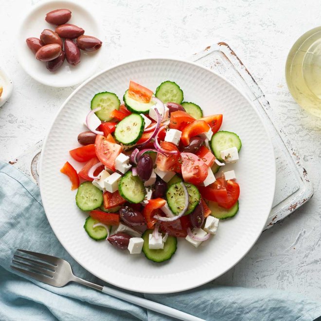 Aunque no hayas ido nunca a Grecia, seguro que conoces la ensalada griega, al menos de nombre. Y es que es una ensalada de verano que encierra todo el sabor del Mediterráneo: tomate, pepino, cebolla, aceitunas y queso feta. Así de sencilla, pero al mismo tiempo absolutamente deliciosa y fresca.