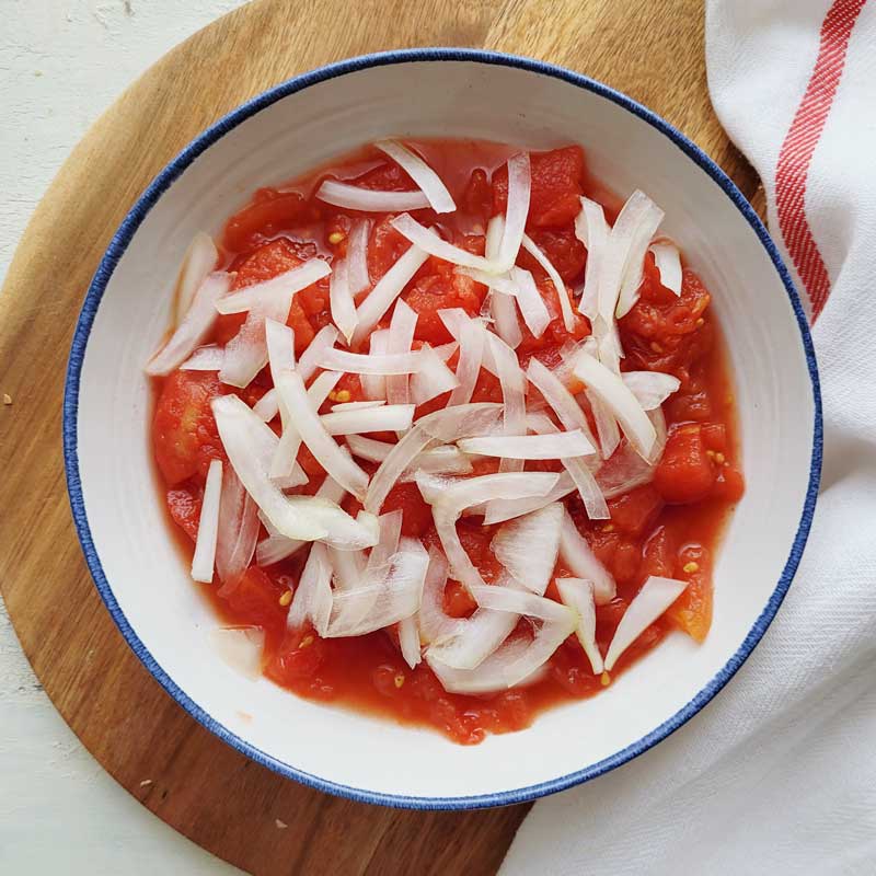 - Si no tienes cebolleta puedes utilizar cebolla, pero para que pierda un poco de fuerza y acidez puedes cortarla y dejarla a remojo en agua, sal y vinagre durante 15 minutos.