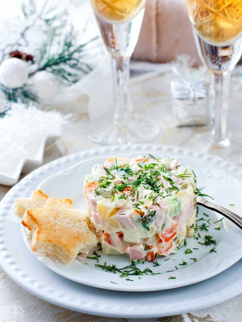 La Ensalada Olivier se luce mejor con una presentación cuidada y elegante. Para lograrlo, utiliza un aro de emplatar para darle una forma cilíndrica y decórala con hierbas frescas como eneldo o perejil. Acompaña con tostadas crujientes, que puedes cortar en formas temáticas como estrellas, perfectas para eventos festivos. Sirve en platos blancos para destacar los colores de la ensalada y lograr un aspecto sofisticado, ideal para Navidad.