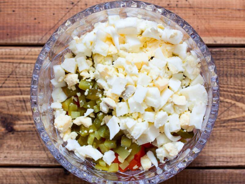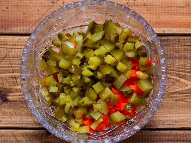 Uno de los secretos de una buena ensalada Olivier es que los ingredientes estén picados de forma homogénea. Esto no solo mejora la presentación, sino que garantiza que cada bocado tenga una combinación equilibrada de sabores. - Prueba variantes de proteínas