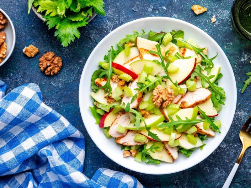 La versión de ensalada Waldorf con pollo también es muy popular, ya que gracias a las proteínas que aporta el pollo esta ensalada se convierte en un plato muy completo que puedes utilizar como plato único.