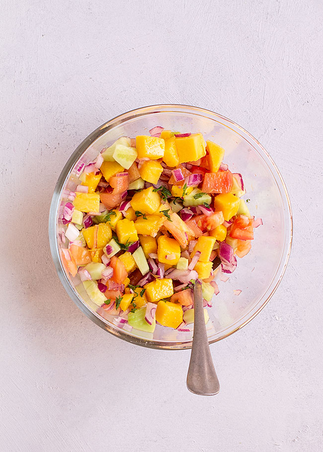 - 1 mango maduro, cortado en cubos para la salsa y tiras para la ensalada