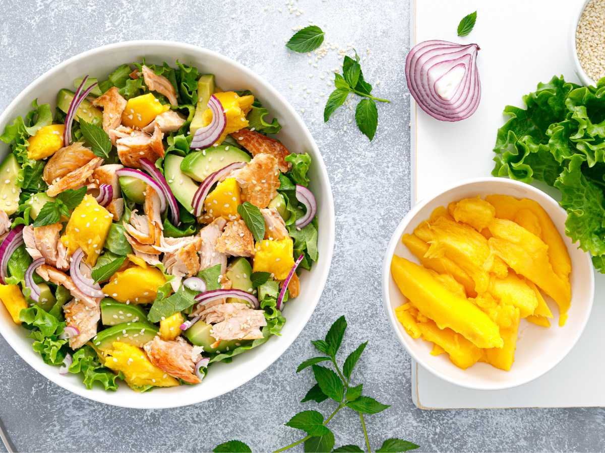 El mango no solo es conocido por su delicioso sabor, sino también por sus beneficios para la salud, ya que está lleno de nutrientes esenciales como la vitamina C, vitamina A y fibra. Combinado con una variedad de ingredientes frescos y sabrosos, como aguacate, pepino, tomates cherry, mozzarella y más, el mango se convierte en el protagonista perfecto para crear ensaladas vibrantes y llenas de color.