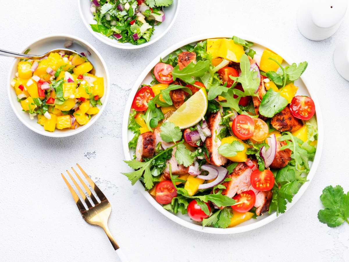 El toque tropical de la salsa de mango y el cítrico de la lima hacen de esta ensalada de pollo a la plancha una opción refrescante para cualquier época del año.