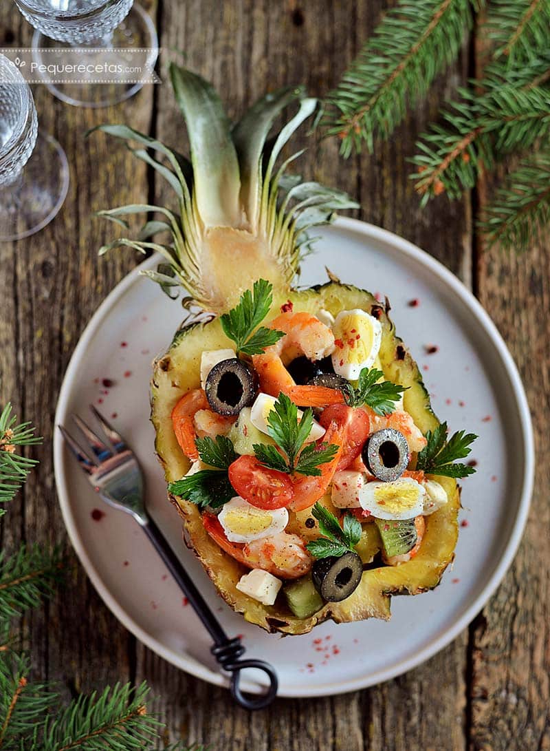 Ensalada para Navidad de piña rellena con frutas y marisco